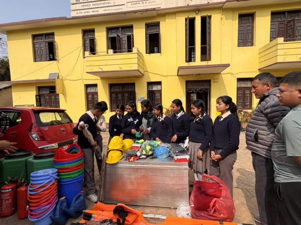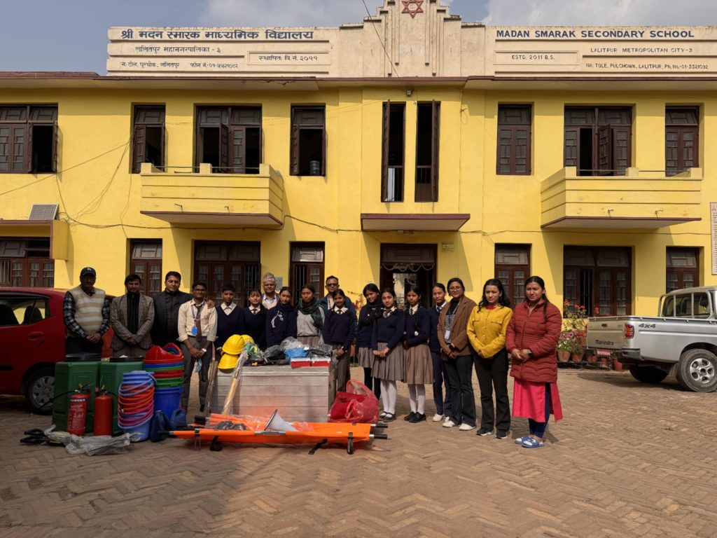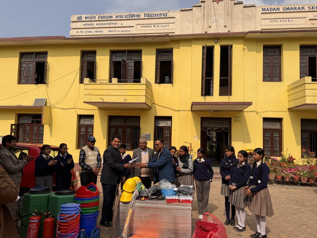 Meanwhile, Madan Smarak Secondary School in Lalitpur received 23 items, such as safety goggles, helmets, dust masks, safety whistles, leather gloves, kneecaps, blankets, plastic buckets, fire extinguishers, first aid boxes, multi-tool knives, megaphones, ropes, shovels, sledgehammers, stretchers, spades, trowels, gardening gloves, watering cans, waste segregation bins, compost bins, and a steel box. These resources are designed to support emergency preparedness, waste management, and green school initiatives.