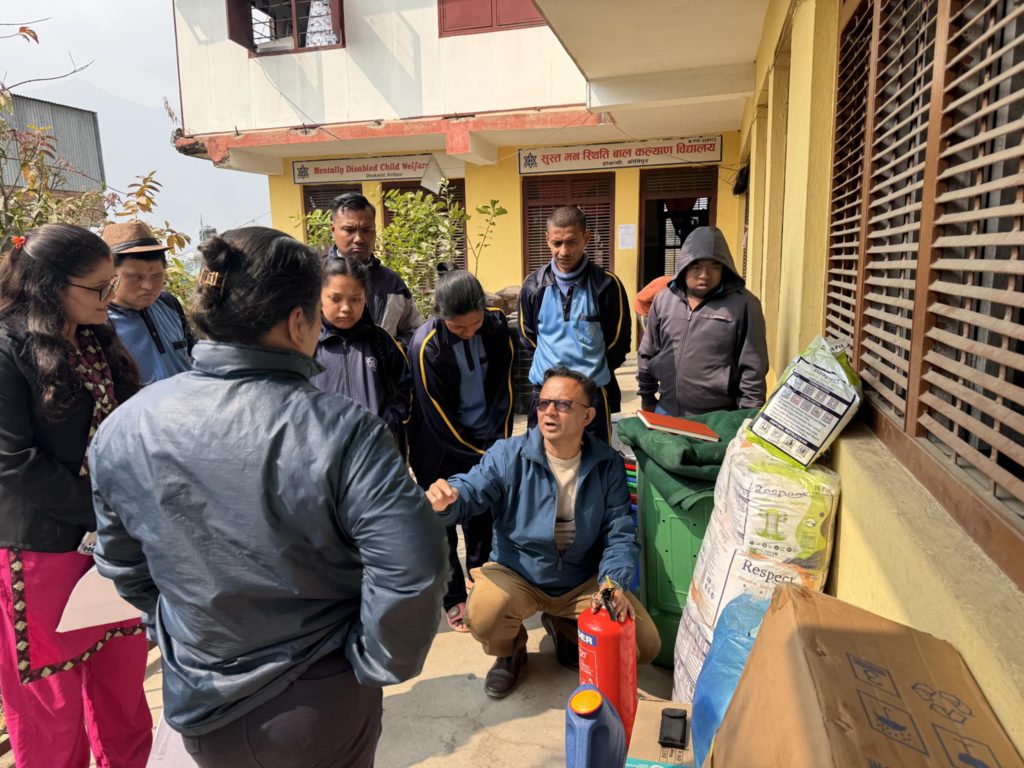 As part of the support, Sustamanasthiti Bal Kalyan Vidyalaya in Kirtipur received 13 items, including dust masks, fire extinguishers, first aid boxes, multi-tool knives, stretchers, watering cans, waste segregation bins, compost bins, a wheelchair, walking canes, diapers, pads, and blankets.